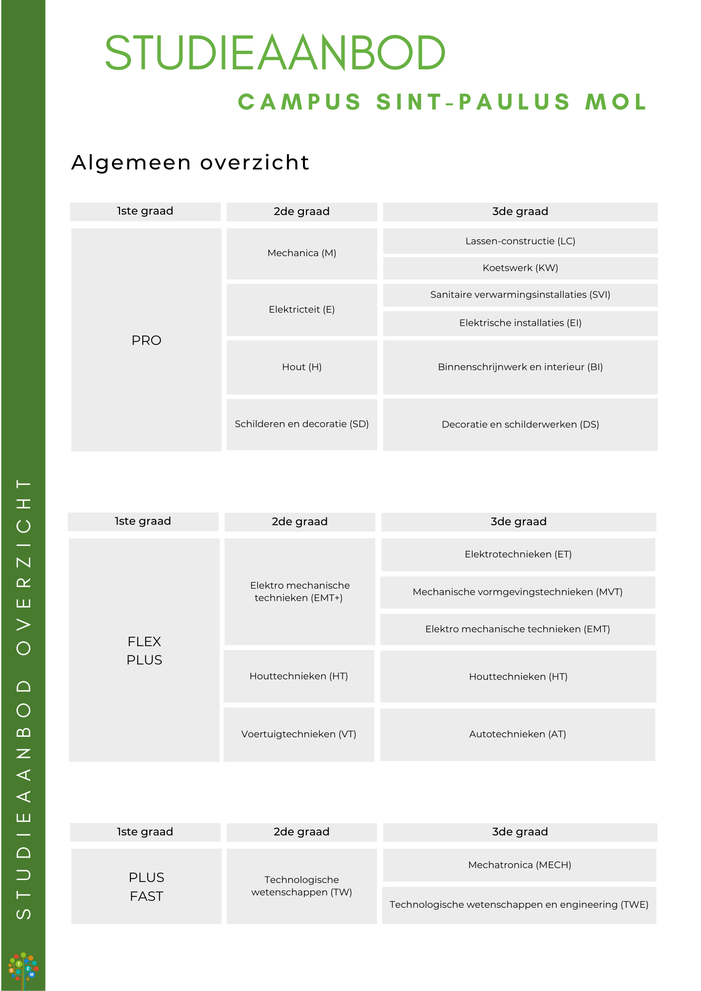 3de graadDomein:STEM Domeingebonden doorstroomfinaliteit: Mechatronica Technologische wetenschappenen engineering Dubbele finaliteit: Autotechnieken Elektro mechanische technieken Elektrotechnieken Houttechnieken Mechanische vormgevingstechnieken Finaliteit arbeidsmarkt: Binnenschrijnwerk en interieur Decoratie en schilderwerken Elektrische installaties Lassen - constructie Koetswerk Sanitaire en verwarmingsinstallaties